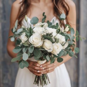 A beautiful bouquet featuring white roses and green eucalyptus, perfect for weddings or special occasions.